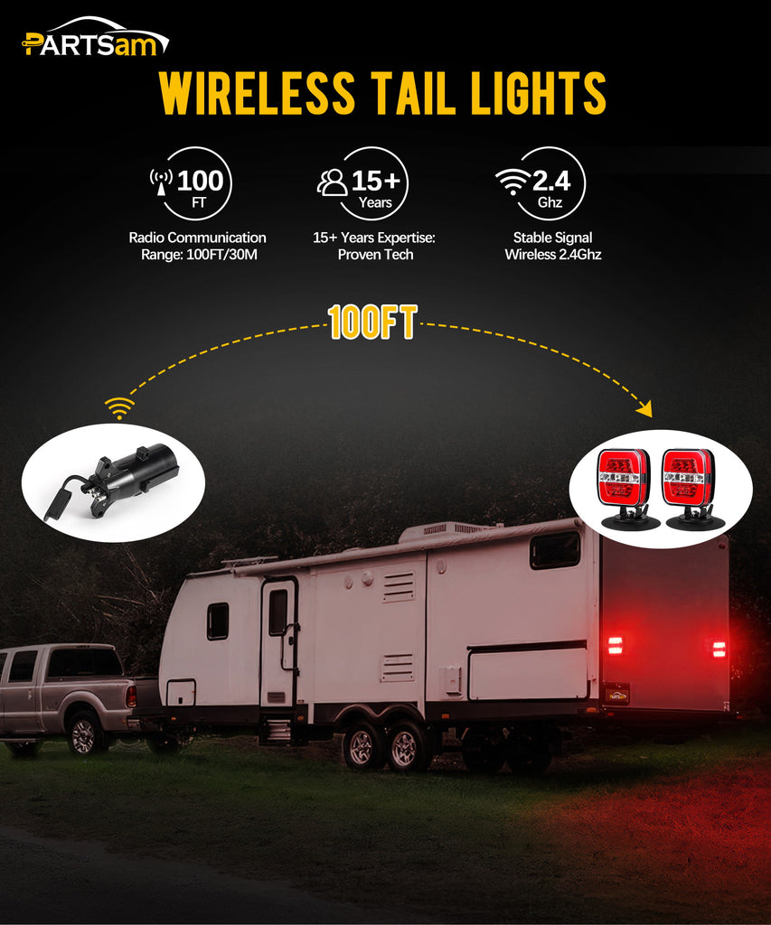 Partsam Wireless Trailer Light Kit, Portable Magnetic LED Tow Lamp, Stop Brake Turn Reverse Towing Tail Lights w/Metal Base Suction Cup 7-Pin Plug for Trucks Trailers 12-24V IP67 Waterproof